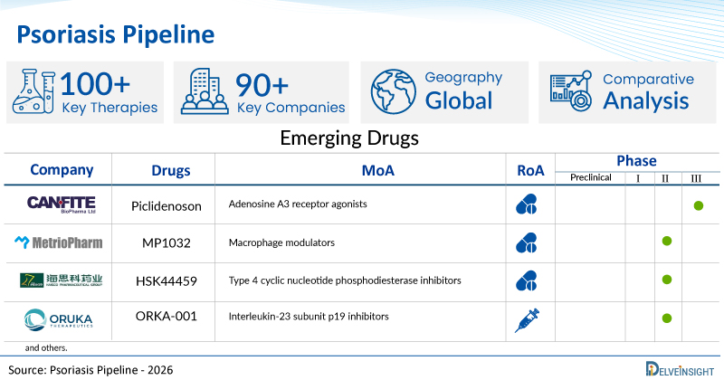 - Promising pipeline psoriasis therapies, such as Piclidenoson, MP1032, HSK44459, ORKA-001, S-4321, UA-026, Zasocitinib, SGX302, CYPS317, SFA-002, D-2570, RSS0393, ICP-488, LPX-TI641, SDC-1801, SYHX1901, HB0017, TQH2929, GM-XAN003, ART26.12, and others, are in different phases of psoriasis clinical trials.